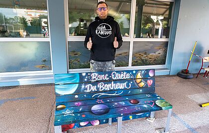 - Les enfants ont confié à Florian leur volonté de voir apparaitre sur leur banc, les couleurs de l’arc en ciel, beaucoup de cœurs, d’amour, d’étoiles, de planètes.