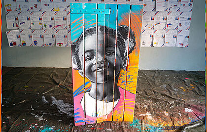 Ses œuvres sont des portraits grands formats d'anonymes avec des explosions de couleurs et de graffiti.