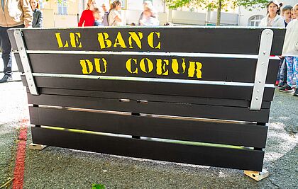 - Les élèves confient à Grégory la performance suivante ; Ils souhaitent voir apparaitre sur le banc, des enfants qui se tiennent la main, des visages, des mains, le monde, la lune, le soleil, le ciel, les étoiles, un arc en ciel, des ballons des jouets des cadeaux, des fleurs, des anges. Ils imaginent ce banc coloré en Orange, bleu, vert, rouge, jaune, violet, rose, multicolore, doré et argenté