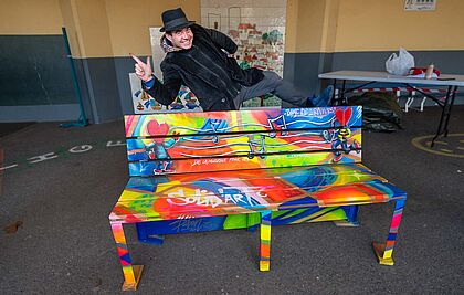 - Les enfants ont confié à Faben d’interpréter leurs réflexions autour d’un système solaire avec des planètes, comme celle des alphas à dessiner sur le banc. Notes de musique sur une portée de ruban, des jeux de sociétés, tels des cartes de l’amitié, des dominos des pions échecs, dames avec un arc en ciel de mains colorés.