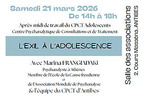 Samedi 21 mars, le CPCT Antibes (Centre Psychanalytique de Consultations et de Traitement pour adolescents et parents) porpose une après-midi de travail sur le thème "L'exil à l'adolescence".