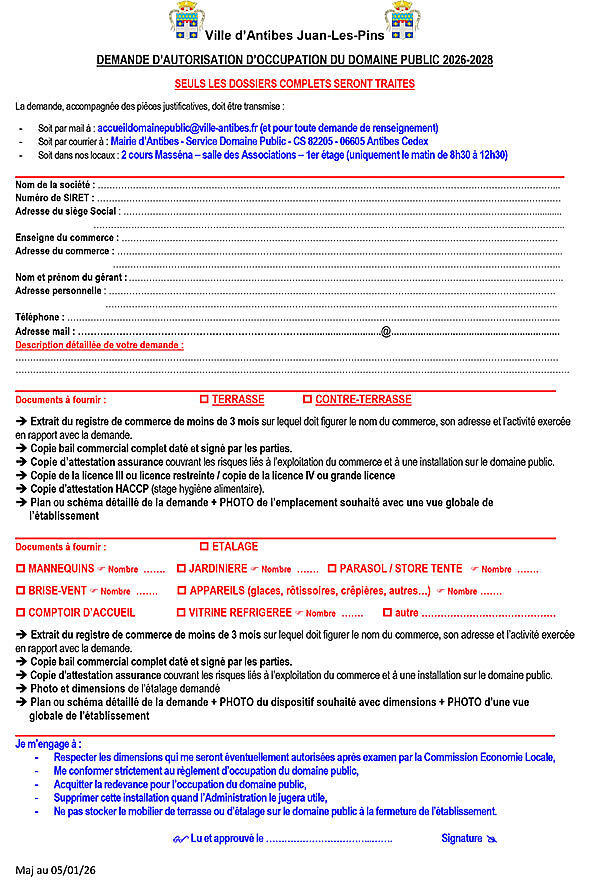 Toute occupation du domaine public doit faire l'objet d'une autorisation préalable dans le respect du règlement d'occupation du domaine public et du cahier des recommandations. La demande doit être transmise au service du Domaine Public à l'adresse accueildomainepublic@ville-antibes.fr pour faire l'objet d'une instruction et être présentée à la Commission Economie Locale et Valorisation du Domaine Public.