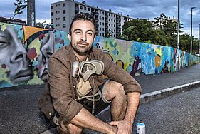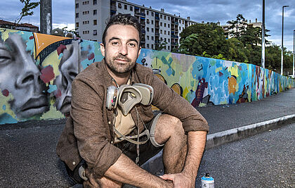 Spécialisé dans le mélange des supports et des techniques, il combine la calligraphie, le pop art et les graffitis, passant de la toile à la fresque murale.