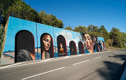 La fresque joue su l'effet d'arches et douvertures, encadrant des portraits d'individus et des symboles de la vie (comme une bougie allumée), créant une composition qui semble regader la route et le paysage.