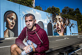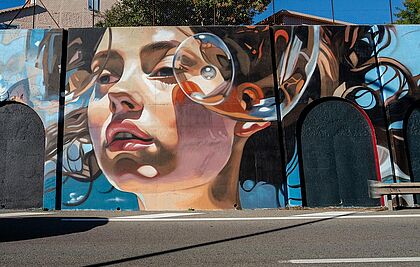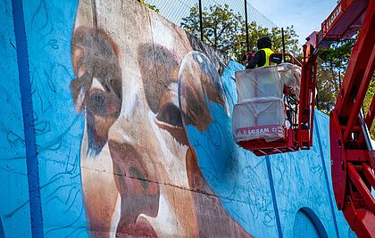 Peinture murale de 302 m² réalisée en 2023 sur un mur de 30m x 6m.