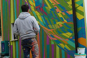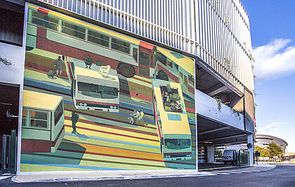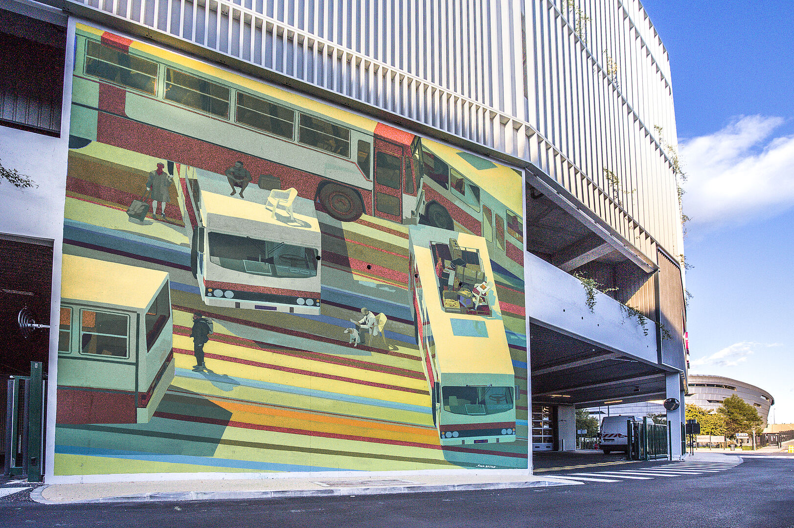 Après son intervention sur la 1ère édition du Festival Coul’Heures d’Automne en 2020, l’artiste Fred Battle a reposé ses couleurs en 2022 pour interpréter la façade du nouveau dépôt de Bus de la C.A.S.A. Son affinité artistique pour la mobilité depuis plusieurs années, son travail précis des couleurs et de leurs superposition en fait un artiste de choix pour ce projet d’envergure porté sur l’interprétation des outils de travail du quotidien.