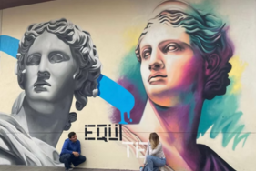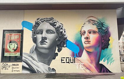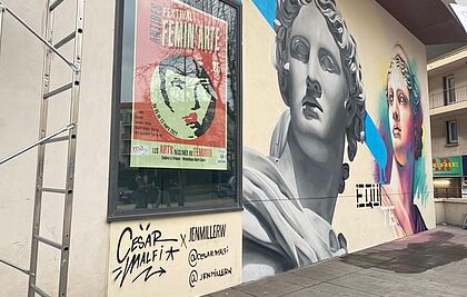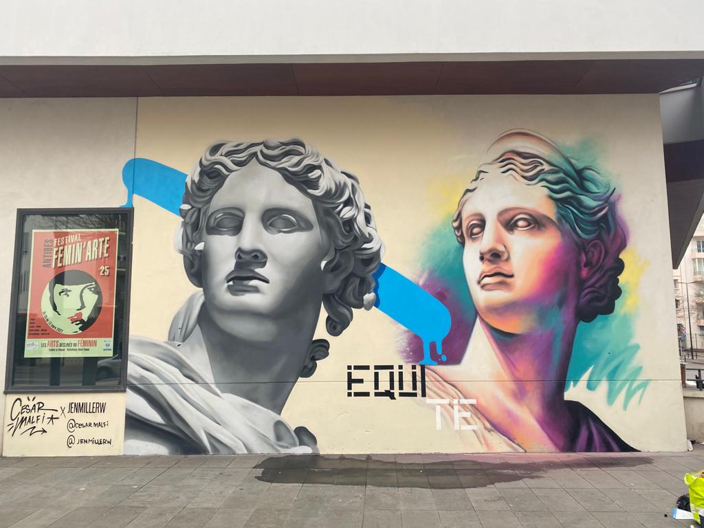 2 artistes phares de la scène Street Art azuréenne se sont réunis de manière inédite autour des valeurs d’égalité Femme / Homme pour la réalisation d’une fresque sur la façade de la Médiathèque Albert Camus.