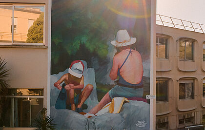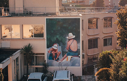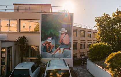 “Cette fresque représente un enfant et sa grand-mère se baignant ensemble dans la rivière. La scène, simple et quotidienne, évoque la tendresse des gestes partagés entre générations et la tranquillité des moments d’été. Située sur le mur du service de gériatrie de l’hôpital, l’œuvre cherche à transmettre un sentiment de sérénité et de bien-être, tant aux patients qu’au personnel soignant. Un bain en famille est une image de repos, d’affection et de lien avec la nature, un rappel de la beauté qui se cache dans les instants les plus simples de la vie”.