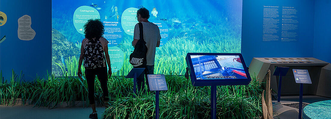 Au cœur du bâtiment, un bleu profond recouvre tout l’espace et plonge instantanément le visiteur dans un univers marin scénographié. Une exposition permanente dévoile les quatre principaux habitats de Méditerranée : herbier de posidonies, fonds sableux, récifs coralligènes et la pleine eau. Un dispositif multimédia interactif enrichit l’exposition, avec en toile de fond, la connaissance des fonds marins et l’impact de l’Homme sur l’environnement et une sensibilisation à la problématique des déchets que l’on trouve sur nos côtes.