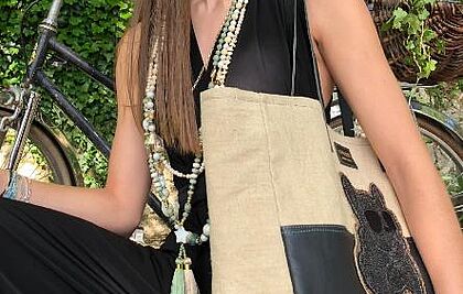 Je crée des sacs à mains, pochettes, accessoires de mode et des bijoux. Je mélange des matières comme le cuir et le tissu. J'utilise la technique du repoussage sur certains de mes sacs. Je fais le dessin, la peinture et teinture sur cuir. Je fabrique une collection de bijoux principalement réalisés en tissage de perles miyuki et de perles semi-précieuses.
