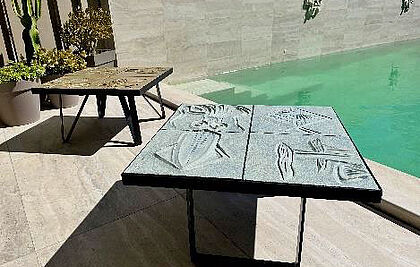 PLATEAUX : Toutes les pièces sont uniques dans des compositions très variées. TABLES BASSES : plateau composé de dalles en grès.