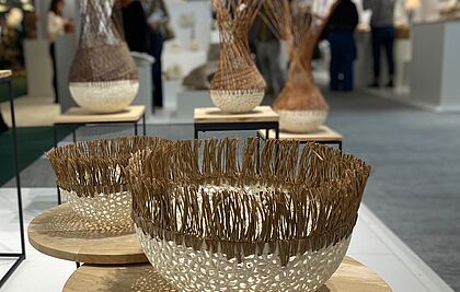 Son travail aujourd’hui s’enrichit de matières naturelles tissées sur ses cocons de porcelaine, des pièces uniques en volume, de grandes pièces murales projetant des ombres mais également un travail sculptural né de son besoin de transmettre le sentiment de fragilité de la nature, sa sensibilité, l’antinomie de son être.