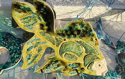 Ses céramiques décoratives sont des pièces uniques : animaux marins, dauphins, hippocampes, habitants des forêts, chouettes, hiboux, geckos, masques portant l’empreinte de ses séjours à l’étranger (Égypte, Afrique, Mexique).