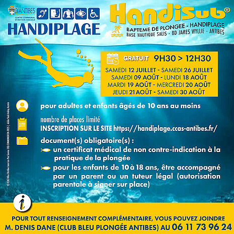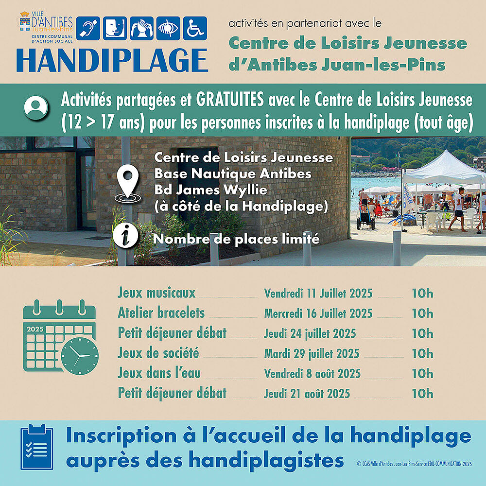 En période estivale, le CCAS d’Antibes Juan-les-Pins propose sur la plage un accompagnement à la baignade destiné aux personnes en situation de handicap (auditif, mental, psychique, moteur ou visuel). Cette handiplage, située sur la base nautique, Boulevard James Wyllie à Antibes, accueille le public en situation de handicap 7 jours / 7 de 8h30 à 18h15 et met à disposition des prestations gratuites :