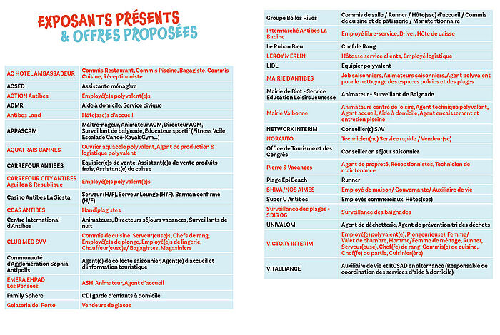 Le Salon "Jobs d'été 17-25", organisé par la Direction Jeunesse de la Ville d'Antibes Juan-les-Pins a eu lieu en mars, chaque année, et permet aux entreprises dans les secteurs de l'animation, du commerce, de la distribution, de l'hôtellerie-restauration, des services à la personne et de l'environnement de proposer près de 1000 offres d'emploi saisonniers aux 17-25 ans.