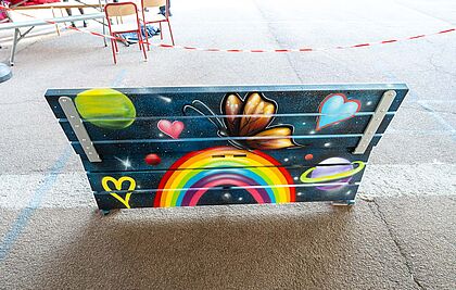 - Les enfants ont confié à Florian leur volonté de voir apparaitre sur leur banc, les couleurs de l’arc en ciel, beaucoup de cœurs, d’amour, d’étoiles, de planètes.