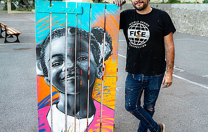 Ses œuvres sont des portraits grands formats d'anonymes avec des explosions de couleurs et de graffiti.