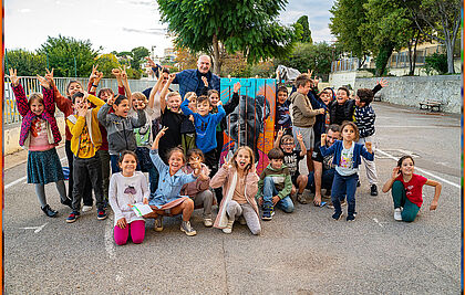 des visages d'enfants réalistes avec des chevelures "travaillées" (Les prénoms des maitresses, des cahiers, des bonbons, des fleurs ou des cœurs, les lettres L A V et le chiffre 1 (comme dans Laval 1), des stylos, des crayons, des billes et des ballons)