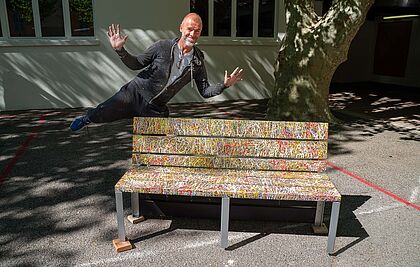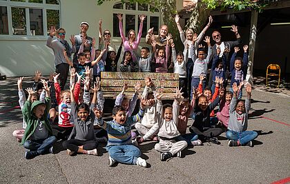 - Les élèves confient à Grégory la performance suivante ; Ils souhaitent voir apparaitre sur le banc, des enfants qui se tiennent la main, des visages, des mains, le monde, la lune, le soleil, le ciel, les étoiles, un arc en ciel, des ballons des jouets des cadeaux, des fleurs, des anges. Ils imaginent ce banc coloré en Orange, bleu, vert, rouge, jaune, violet, rose, multicolore, doré et argenté