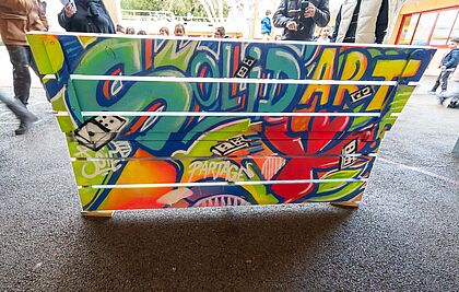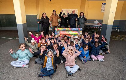 - Les enfants ont confié à Faben d’interpréter leurs réflexions autour d’un système solaire avec des planètes, comme celle des alphas à dessiner sur le banc. Notes de musique sur une portée de ruban, des jeux de sociétés, tels des cartes de l’amitié, des dominos des pions échecs, dames avec un arc en ciel de mains colorés.